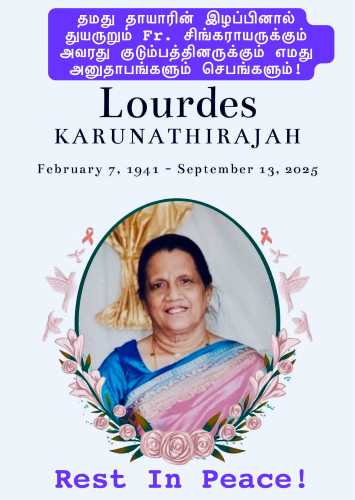 கனடா மொன்றியல் மீட்பின் அன்னை மறைத்தள பங்குத்தந்தை அருட்தந்தை ஜேம்ஸ் சிங்கராயர் அவர்களின் அன்புத்தாயார் திருமதி லூட்ஸ் கருணாதிராஜா அவர்கள் புரட்டாதி மாதம் 14ஆம் திகதி கடந்த ஞாயிற்றுக்கிழமை இறைவனடி சேர்ந்தார்.
