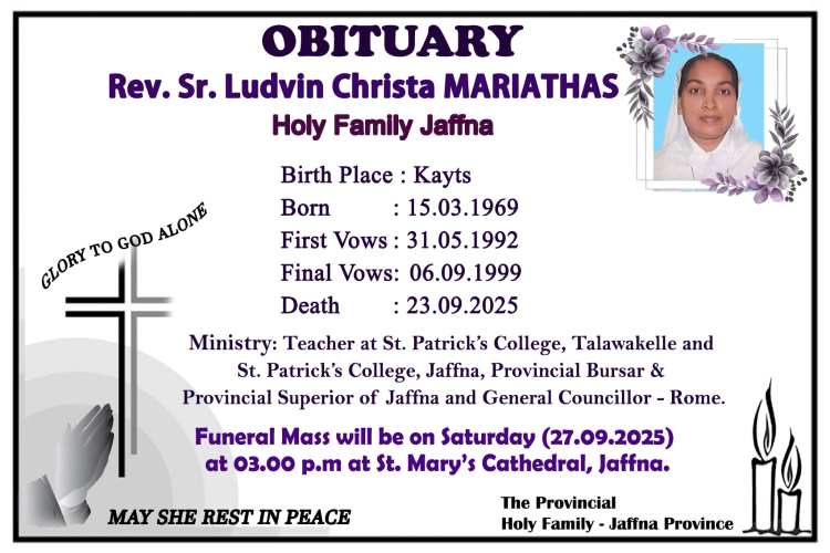 போர்டோவின் திருக்குடும்ப கன்னியர் சபை அருட்சகோதரி லுட்வின் கிறிஸ்ரா மரியதாஸ் அவர்கள் புரட்டாதி மாதம் 23ஆம் திகதி செவ்வாய்க்கிழமை இறைவனடி சேர்ந்தார்.