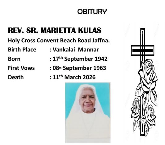 திருச்சிலுவை கன்னியர் சபை மூத்த அருட்சகோதரி அந்தோனி மரியற்றா குலாஸ் அவர்கள் பங்குனி மாதம் 11ஆம் திகதி கடந்த புதன்கிழமை இறைவனடி சேர்ந்தார்.