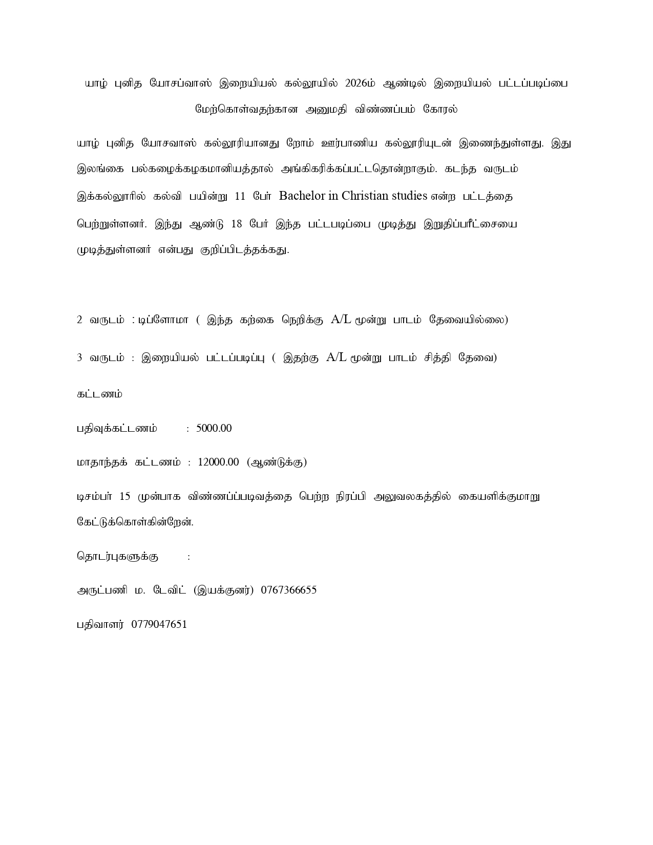 யாழ். மறைமாவட்ட அகவொளி குடும்பநல நிலையத்தால் நடாத்தப்படும் உள ஆற்றுப்படுத்தல் டிப்ளோமா மற்றும் இறையியல் பட்டப்படிப்புக்கான புதிய விண்ணப்பங்கள் கோரப்பட்டுள்ளன.
