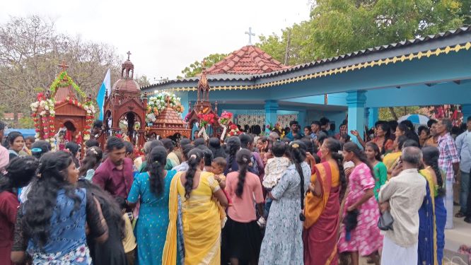 தொடர்ந்து திருச்சொருபங்கள் வீதி வழியாக வேளாங்கன்னி சிற்றாலயத்திற்கு எடுத்துச்செல்லப்பட்டு அன்று மாலை சிறப்பு திருப்பலியும் ஒப்புக்கொடுக்கப்பட்டது.