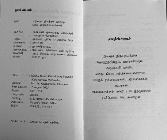 “மடுமாதா திருத்தலத்தின் வரலாறு” நூல் வெளியீடு தை மாதம் 24ஆம் திகதி சனிக்கிழமை மன்னார் தோட்டவெளி – வேதசாட்சிகளின் இராக்கினி திருத்தலத்தில் நடைபெற்றது.