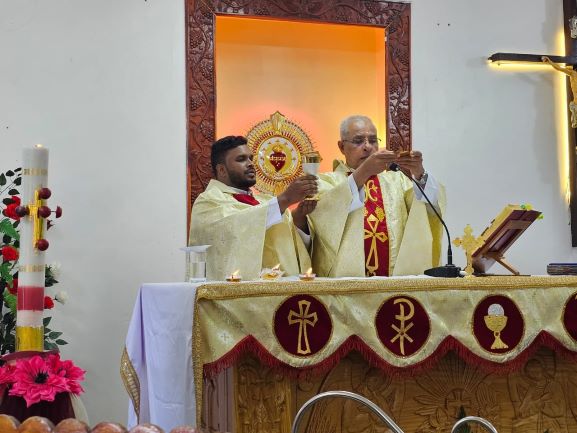 திருப்பலியை யாழ். மறைமாவட்ட குருமுதல்வர் அருட்தந்தை ஜெபரட்ணம் அவர்கள் தலைமைதாங்கி ஒப்புக்கொடுத்தார்.
