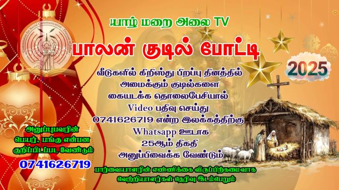 கிறிஸ்து பிறப்பு விழாவில் வீடுகளில் பாலன் குடில் அமைக்கும் பாரம்பரியத்தை ஊக்குவிக்கும் நோக்கில் யாழ். மறைமாவட்ட மறைநதி கத்தோலிக்க ஊடக மையத்தால் பாலன்குடில் போட்டி நடாத்த ஏற்பாடுகள் முன்னெடுக்கப்பட்டுள்ளன.