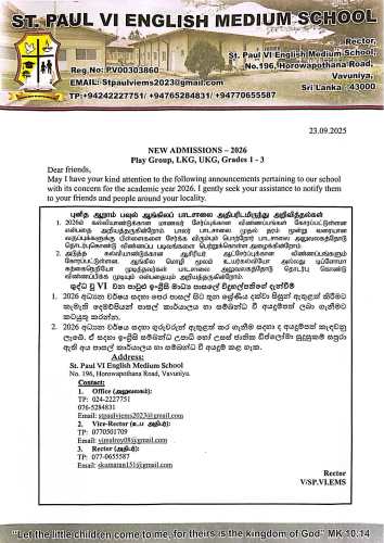 மன்னார் மறைமாவட்டம் வவுனியா புனித ஆறாம் பவுல் ஆங்கில பாடசாலையின் 2026ஆம் கல்வியாண்டிற்கான மாணவர்கள் மற்றும் ஆசிரிய ஆட்சேர்ப்பிற்கான விண்ணப்பங்கள் கோரப்பட்டுள்ளன.