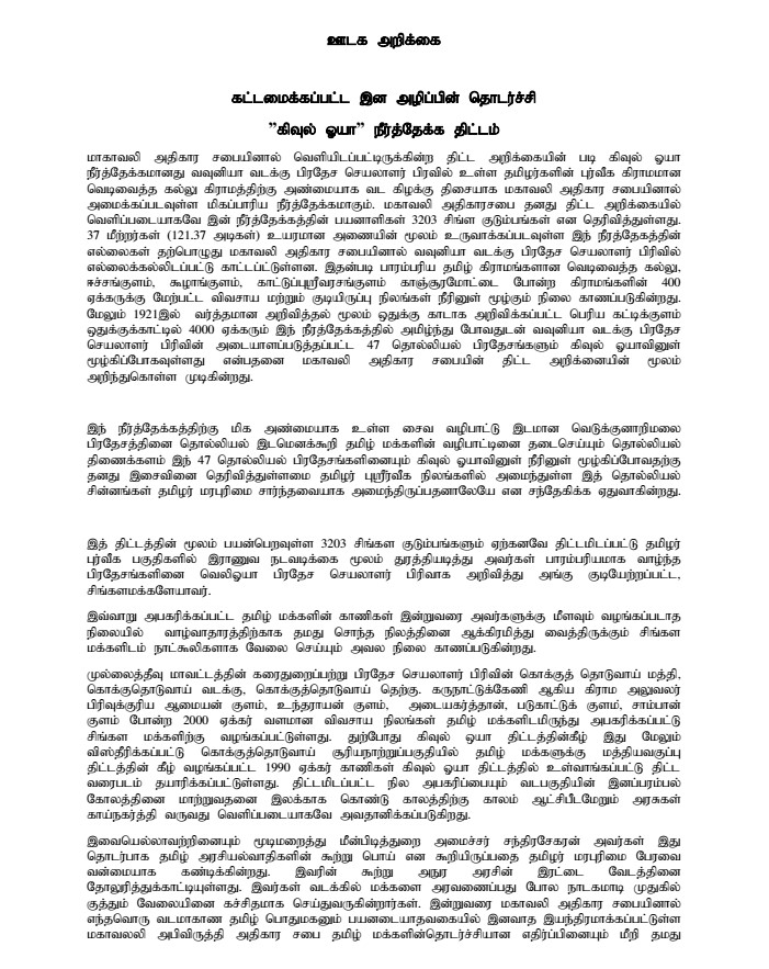 The statement also recalled that 2,000 acres of fertile agricultural land in the Mullaitivu district had previously been seized from Tamils and handed over to Sinhalese settlers. It warned that the Kivil Oya project will further expand such land grabs, accusing successive governments of using these schemes to alter the ethnic composition of the North.