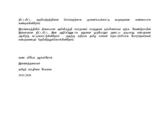 The Council emphasized that the government’s persistence in implementing resettlement plans, despite opposition from the Tamil population and without benefiting them, undermines reconciliation and raises serious concerns about the future of inter-ethnic harmony in the region.